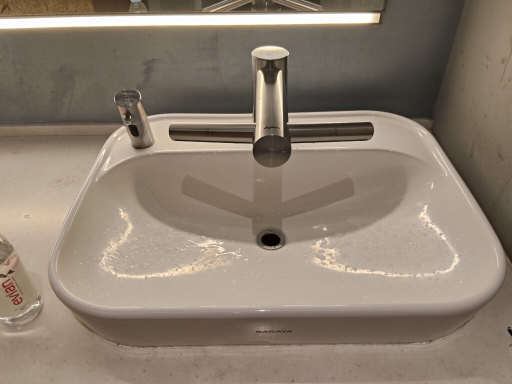 なんだか見慣れない水栓だと思いメーカーのロゴを探したらダイソンでした。飛行機みたいに両側の伸びた部分に手をかざすとブワーって風が出てきます。