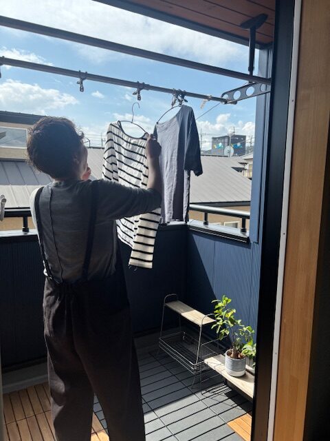 太陽の光で洗濯物を干したいというこだわりも広々バルコニーの提案を頂き、大満足!室内部にランドリーコーナーとたっぷり収納を設けて、お気に入りの空間になりました!